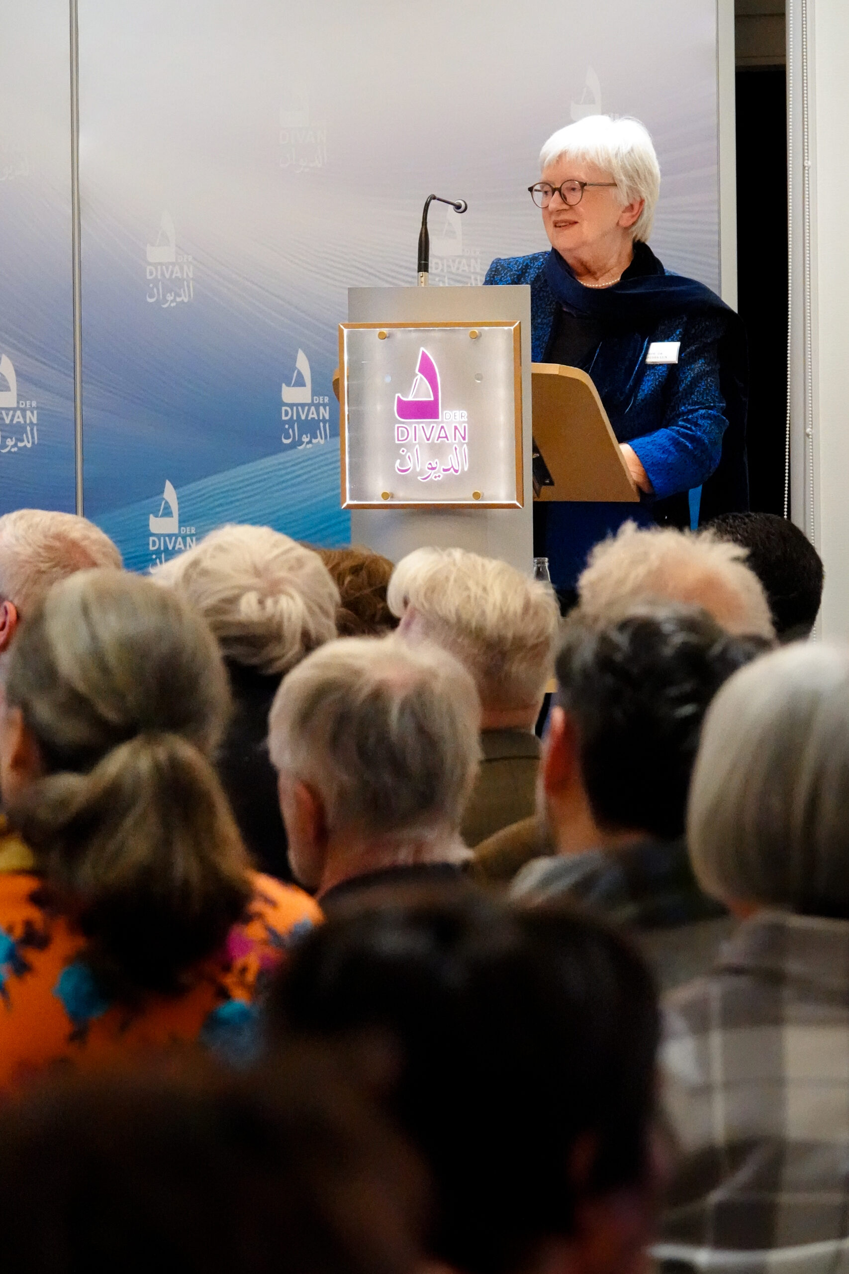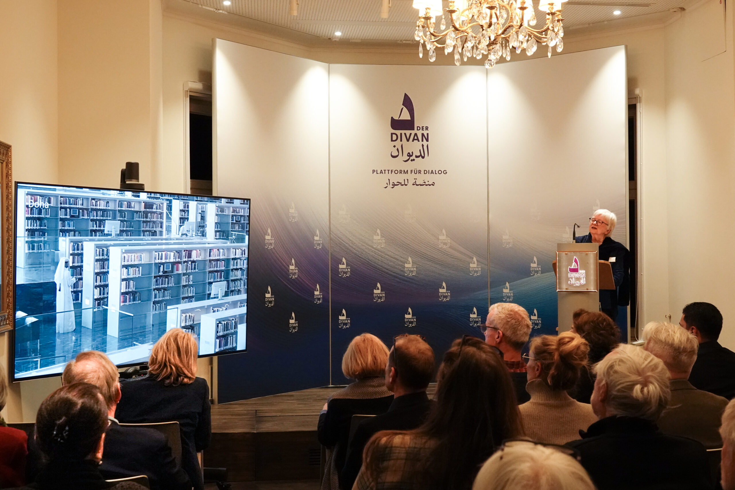 Im Anschluss folgte der ebenso informative wie eindrucksvolle Vortrag von Prof. Dr. Claudia Lux, langjähriges Mitglied des Berliner Buchhändler Clubs und Mitglied des Beirats des Divan. Thematisch standen dabei die aktuellen Entwicklungen des Bibliothekswesens in den Ländern des Arabischen Golfs im Vordergrund. Zahlreiche Gäste waren der Einladung gefolgt, um ihren Ausführungen zu lauschen.
