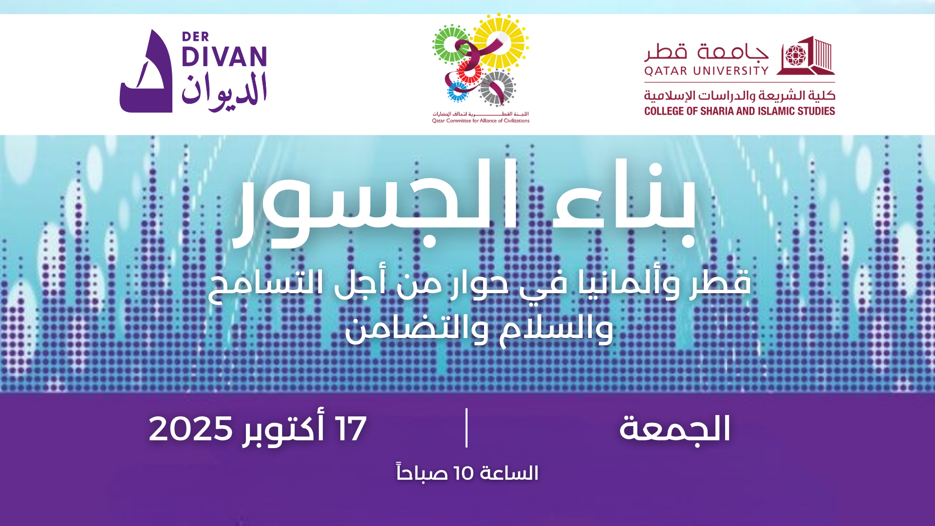 يتشرف الديـوان – البيت الثقافي العربي، وبالتعاون مع اللجنة القطرية لتحالف الحضارات وكلية الشريعة والدراسات الإسلامية بجامعة قطر، بدعوتكم إلى يوم حواري مميز يجمع بين قطر وألمانيا. تحت شعار «بناء الجسور»، يلتقي عدد من الشخصيات البارزة في مجالات الدبلوماسية والعلم والدين والثقافة لمناقشة سبل تعزيز الفهم المتبادل، والسعي المشترك من أجل ترسيخ قيم التسامح والسلام والتضامن.