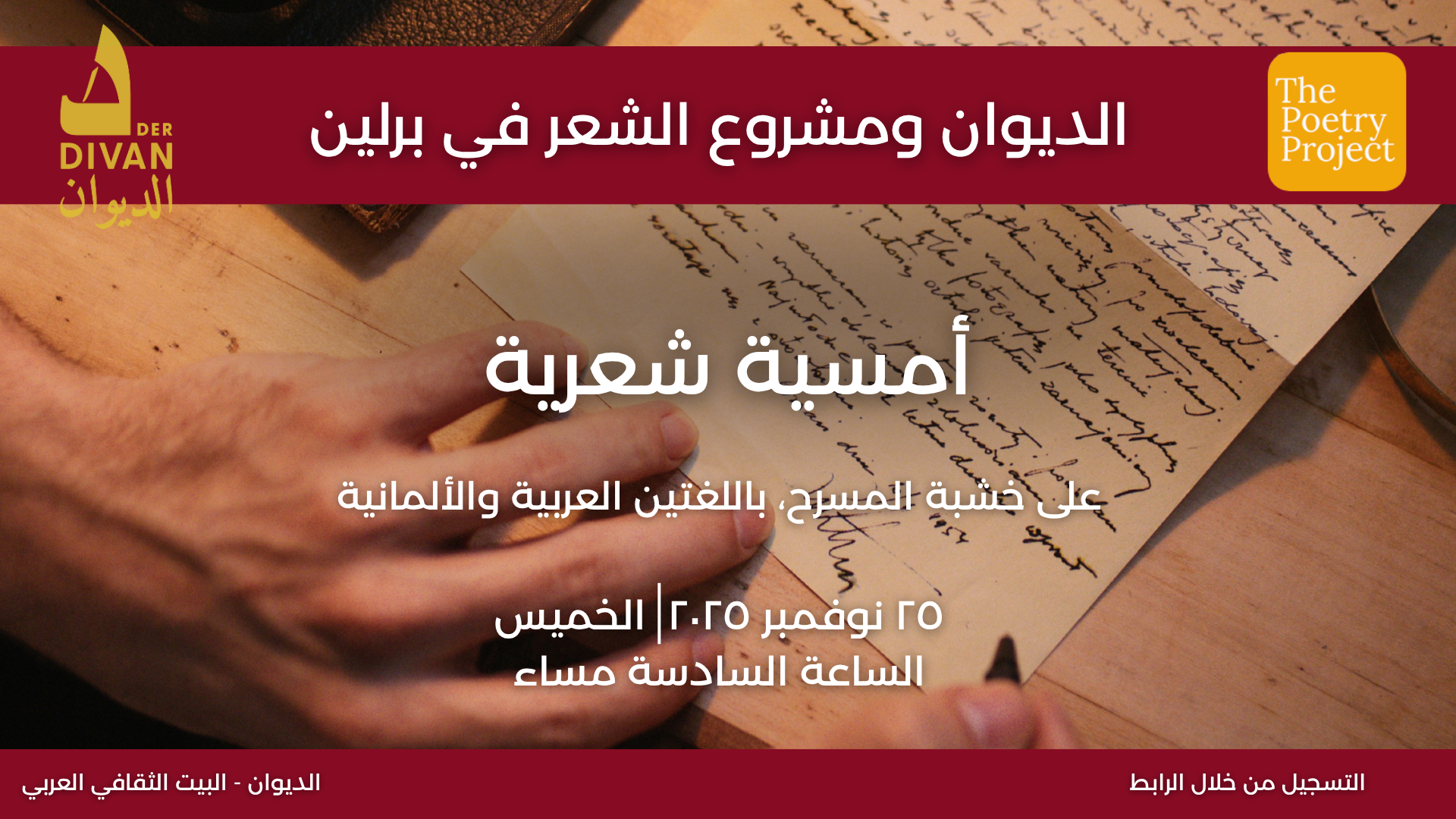 Der Divan - das Arabische Kulturhaus Schützallee 27-29, Berlin, Berlin, Deutschlandفي أجواءٍ تنبض بالشعر واللغة والإحساس، يدعوكم الديوان - البيت الثقافي العربي وجمعية مشروع الشعر برلين (The Poetry Project e.V.) إلى حضور أمسية شعرية مميّزة، وذلك يوم الخميس الموافق 20 نوفمبر 2025، في تمام الساعة السادسة مساءً في الديوان.