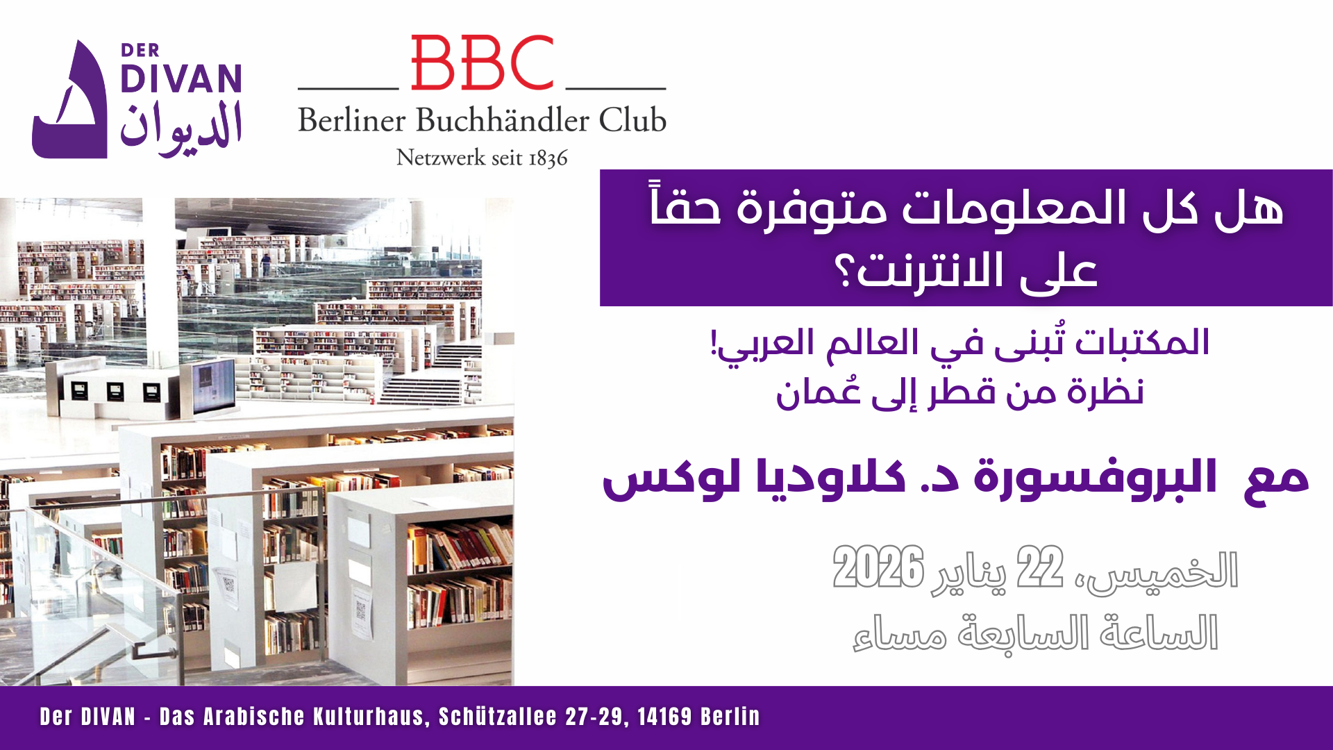 يتشرف الديوان - البيت الثقافي العربي، وبالتعاون مع جمعية أصحاب المكتبات في برلين العريقة (BCC)، بدعوتكم لحضور فعالية الافتتاح لعام 2026، بعنوان: هل كل المعلومات متوفرة حقاً على الإنترنت؟ المكتبات تُبنى في الخليج العربي! نظرة من قطر إلى عُمان تُقدِّم السَّيدة البروفسورة كلاوديا لوكس، العضو منذ سنوات طويلة في نادي BCC وعضو مجلس أمناء الديوان، […]