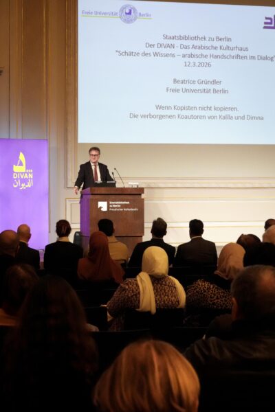 Am Donnerstag, den 12. März 2026, fand in der Staatsbibliothek zu Berlin – Unter den Linden der Auftakt der neuen Veranstaltungsreihe „Schätze des Wissens – Arabische Handschriften im Dialog“ statt. Die Reihe ist eine Kooperation zwischen Der Divan – Das Arabische Kulturhaus und der Staatsbibliothek zu Berlin (STABI) und widmet sich arabischen Handschriften als bedeutendem Teil des globalen kulturellen Erbes. Den Anfang bildete der Vortrag von Prof. Dr. Beatrice Gründler (Freie Universität Berlin) mit dem Titel „Wenn Kopisten nicht kopieren. Die verborgenen Koautoren von Kalila und Dimna“.